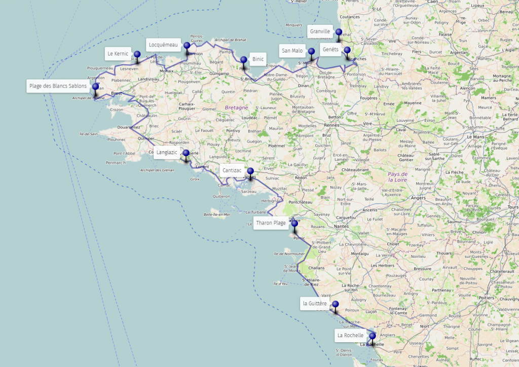 Über Paris reisen wir an den Atlantik nach La Rochelle. Dort folgen wir der Küste nordwärts und ostwärts durch Nouvelle-Aquitaine, Pays de Loire, die Bretagne bis in die Normandie.
