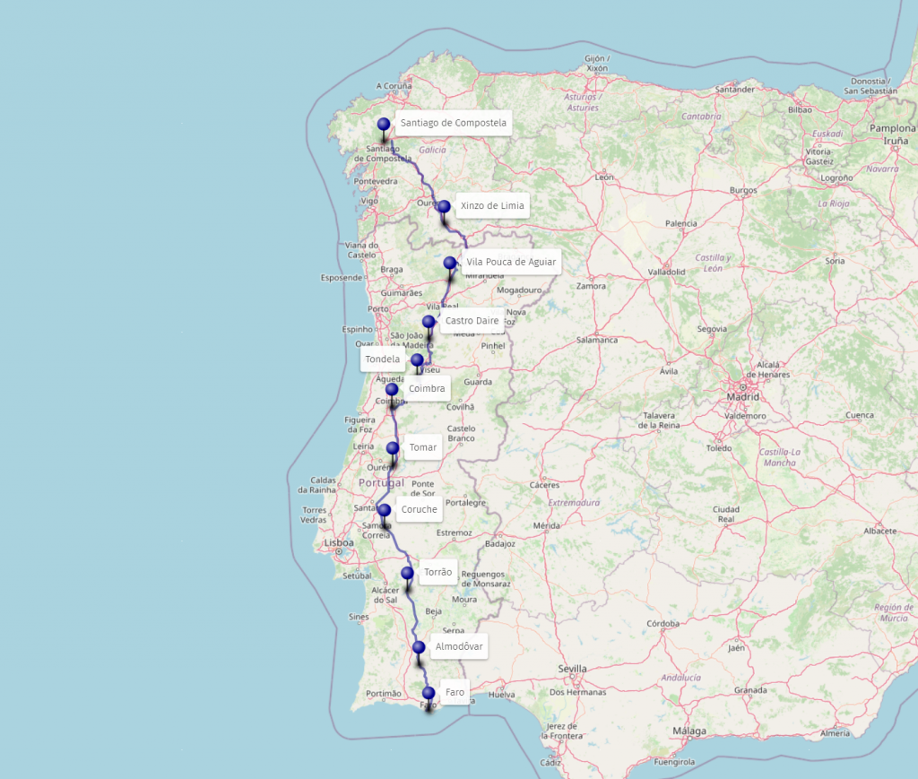Wir starten in Santiago und folgen der EN2 durch Portugal. Von Nord nach Süd, von Chaves bis nach Faro.